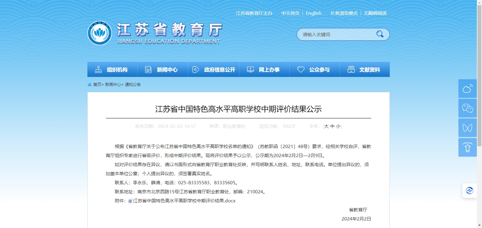 近日,江蘇省教育廳在其官方公布中國特色高水平高職學校中期評價結果公示,通知全文如下: