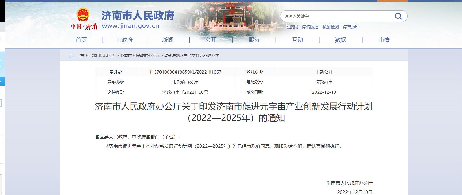濟(jì)南市政府12月10日發(fā)布《濟(jì)南市促進(jìn)元宇宙產(chǎn)業(yè)創(chuàng)新發(fā)展行動(dòng)計(jì)劃(2022—2025年)》。山東省濟(jì)南市政府12月10日發(fā)布《濟(jì)南市促進(jìn)元宇宙產(chǎn)業(yè)創(chuàng)新發(fā)展行動(dòng)計(jì)劃(2022—2025年)》(以下簡(jiǎn)稱《......